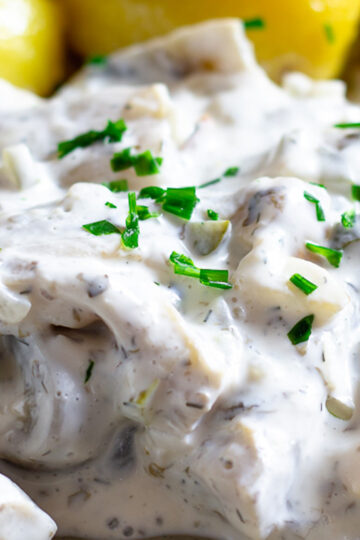 Das beliebteste Rezept für Matjes ist zweifellos Matjeshering nach Hausfrauenart. Hierbei wird der Matjes zu einer Creme aus Schmand, Joghurt und Sahne serviert.