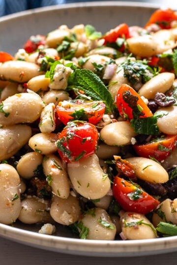 Dieser einfache Dicke-Bohnen-Salat nach griechischer Art ist voller frischer mediterraner Aromen von trockenen Tomaten, Fetakäse, Oliven und frischen Kräutern.
