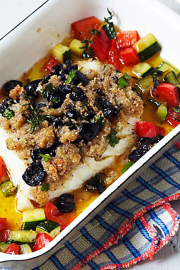 Wegen seines festen Fleisches eignet sich Kabeljau bestens zum Überbacken im Ofen – hier mit einer Kruste aus Paniermehl, Oliven und Gewürzen.