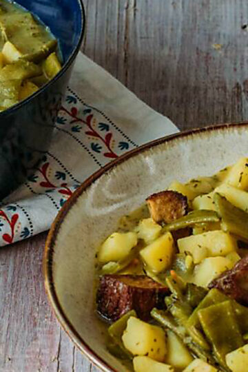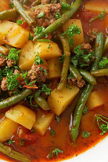 Quietschbohnensuppe mit breiten grünen Bohnen, Rindfleisch und Karttoffeln.