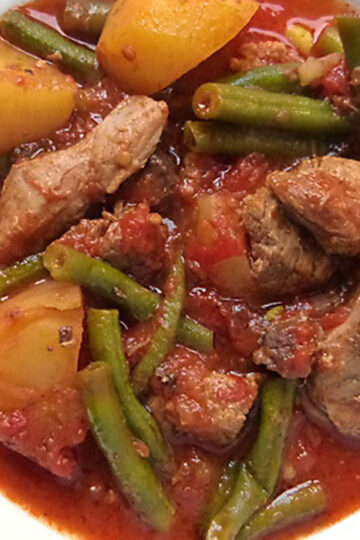 Zeytinyağlı taze fasulye – breite, grüne Bohnen mit Tomaten geschmort – ein immer wieder leckerer Klassiker aus der Türkei. Vegan nur mit Bohnen oder mit Fleisch.