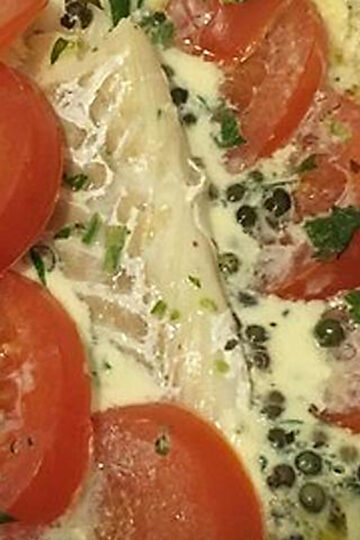 Eine Kombination aus reifen Tomaten mit Kabeljau und den Extra-Kick gibt reichlich grüner Pfeffer.