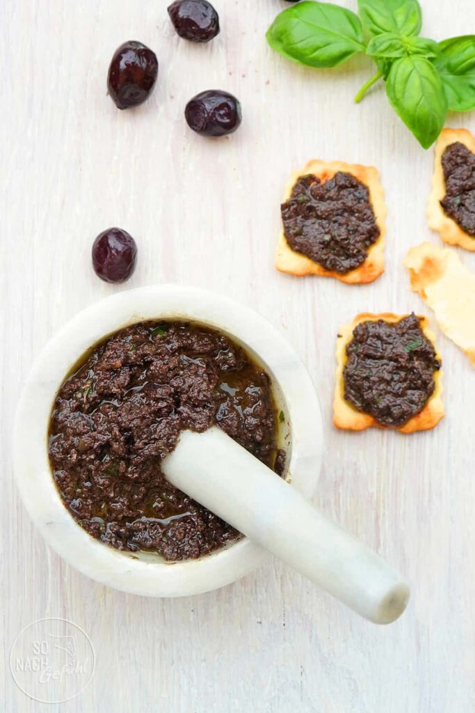 Natürlich wäre es am einfachsten, Oliven bereits ohne Stein zu kaufen. Doch diese Oliven sind häufig vom Aroma her nur ein Schatten ihrer selbst. Ich habe keine Ahnung, wieso das so einen Unterschied macht. Doch nur, wenn Du die Oliven selbst entsteint, bekommt Du das volle Aroma. Der Knoblauch sollte frisch sein und nicht muffig alt und das Olivenöl fruchtig. Dann kann eigentlich nichts schief gehen. Gemixt werden die Zutaten so nach Gefühl, so dass ein Rezept eigentlich überflüssig ist.