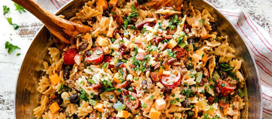Dieser Cowboy Nudelsalat aus saftigem Rinderhack, Speck, Mais, schwarzen Bohnen und Käse und einem würzigen Barbecue Dressing macht süchtig. Der Cowboy-Pasta-Salat ist ein TexMex-Pasta-Salat, wie er verlockender nicht sein könnte. Er ist vollgepackt mit köstlichen Zutaten und eignet sich nicht nur als Beilage für ein großes Fest, sondern auch als eigenständiges Abendessen. Du kannst den gesamten Salat im Voraus zubereiten und nur den Speck vor dem Servieren dazugeben, und so leicht Gäste bewirten oder Mahlzeiten vorbereiten. Dieser Cowboy-Pasta-Salat schmeckt leicht gekühlt, aber auch lauwarm serviert sehr gut.