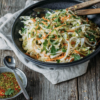 Ganz typisch für die Thai-Küche ist dieses Rezept mit vielen frischen, gesunden und bunten Zutaten, die gemeinsam mit knusprigem Hühnchen super harmonieren. Dazu eine unglaublich aromatische Soße mit süßen, salzigen und scharfen Noten und für den letzten schliff und als absolutes Highlight, ein süß-fruchtig-nussiges Topping, dass schon für sich allein echt genial ist.