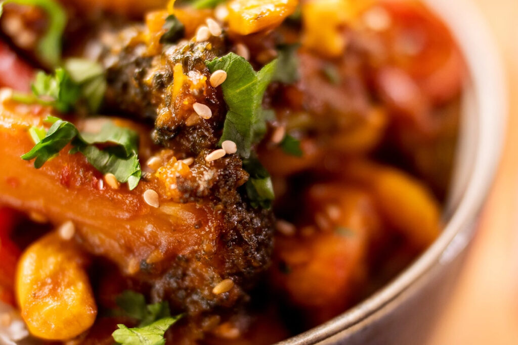 - Cashewkerne mit ca. ½ TL Chiliflocken, ½ TL Kurkuma, 1 EL Honig würzen und gut vermischen. Wenn sich die Röstaromen entfalten und die Cashews mit dem Honig leicht anfangen zu karamellisieren, die Mischung in eine Schale geben. Die Limettenschale darüber geben und beiseite stellen.