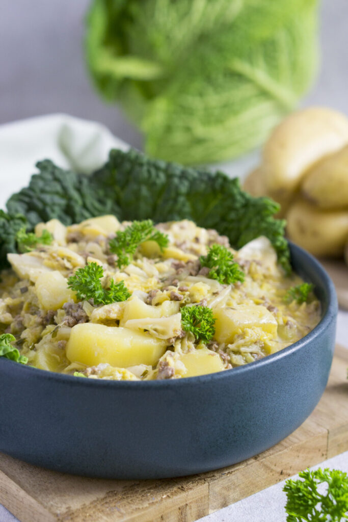 Die Zubereitung ist denkbar einfach, und gelingt garantiert: man braucht nicht viele Zutaten. In 10 Minuten ist der Kohl geschnitten, Zwiebel und Knoblauch gehackt und die Kartoffeln geschält und in Stücke geschnitten. Typisch OnePot-Gericht köchelt das Gemüse in einem großen Topf, man gibt die vorgekochten Kartoffeln und das gebratene Hackfleisch dazu und schmeckt es ab.