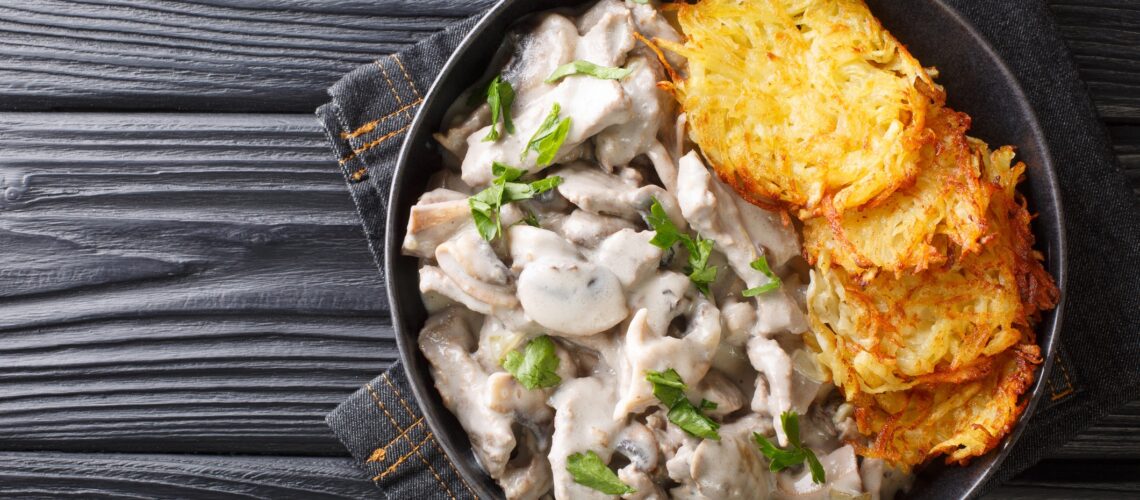 Das Zürcher Geschnetzelte ist ein feines Ragout aus Kalbsfleisch und Champignons, das fast ein bisschen an das Bœuf Stroganoff aus Russland erinnert. Im traditionellen Rezept kommen noch Kalbsnieren dazu, aber darauf haben wir dankend verzichtet.